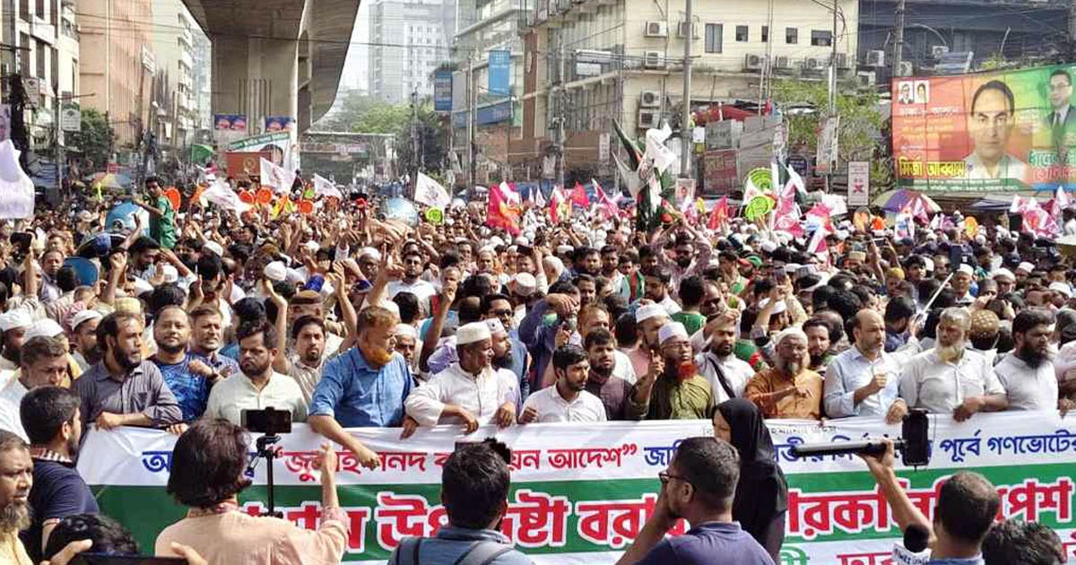 এর আগে সকালে পূর্বঘোষিত কর্মসূচি অনুযায়ী রাজধানীর শাপলা চত্বর থেকে মিছিল নিয়ে পুরানা পল্টনে সংক্ষিপ্ত সমাবেশে মিলিত হন জামায়াত নেতাকর্মীরা। সেখানে অন্য ইসলামি দলগুলোও মিছিল নিয়ে জড়ো হয়।
